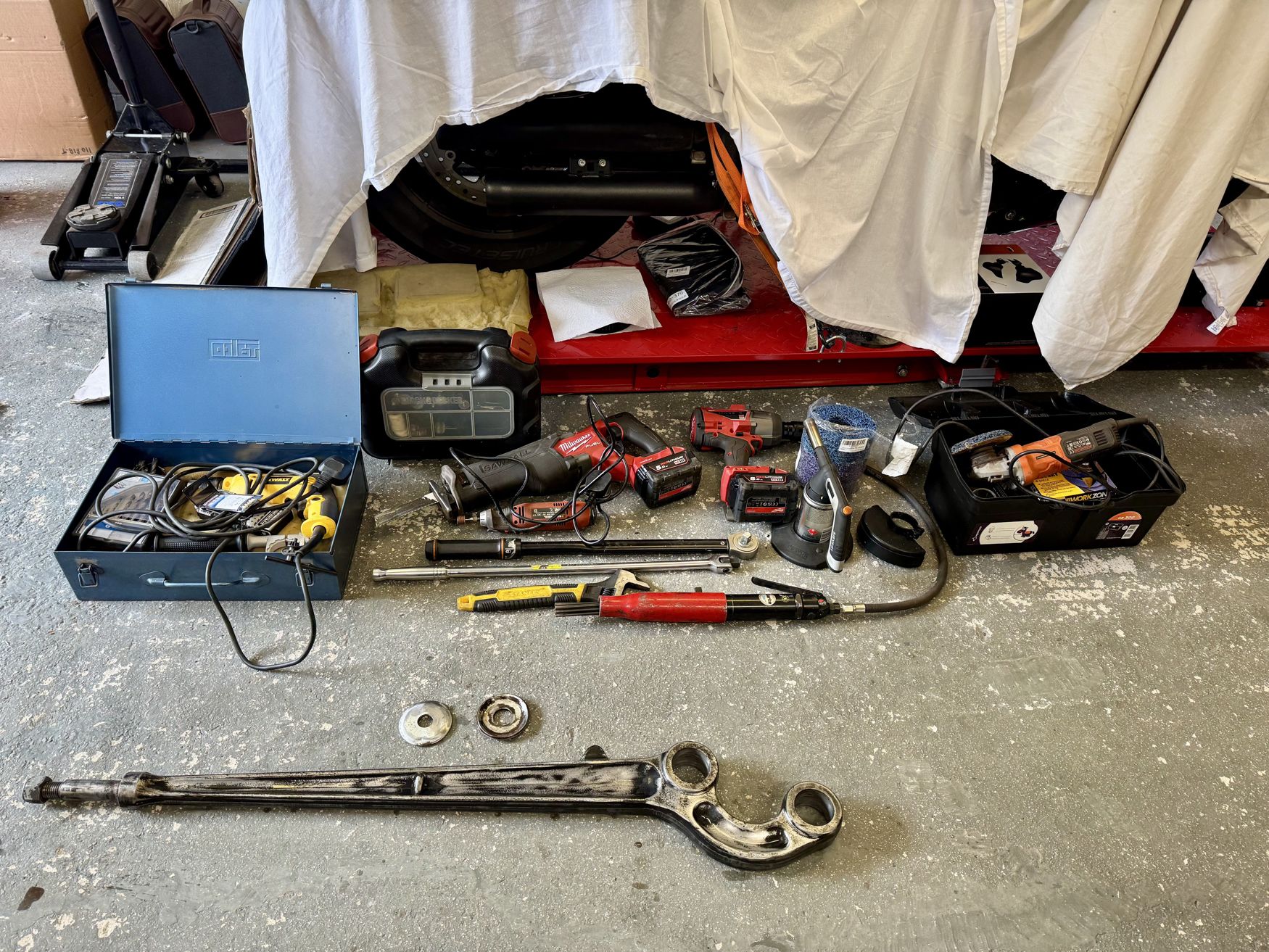 Rear wheel bearing rumble, resulted in a full refresh on the rear axle and a chassis treatment. One stuck caliper bolt has slowed progress though. 2017 5.0 V8 Supercharged RRS SVR