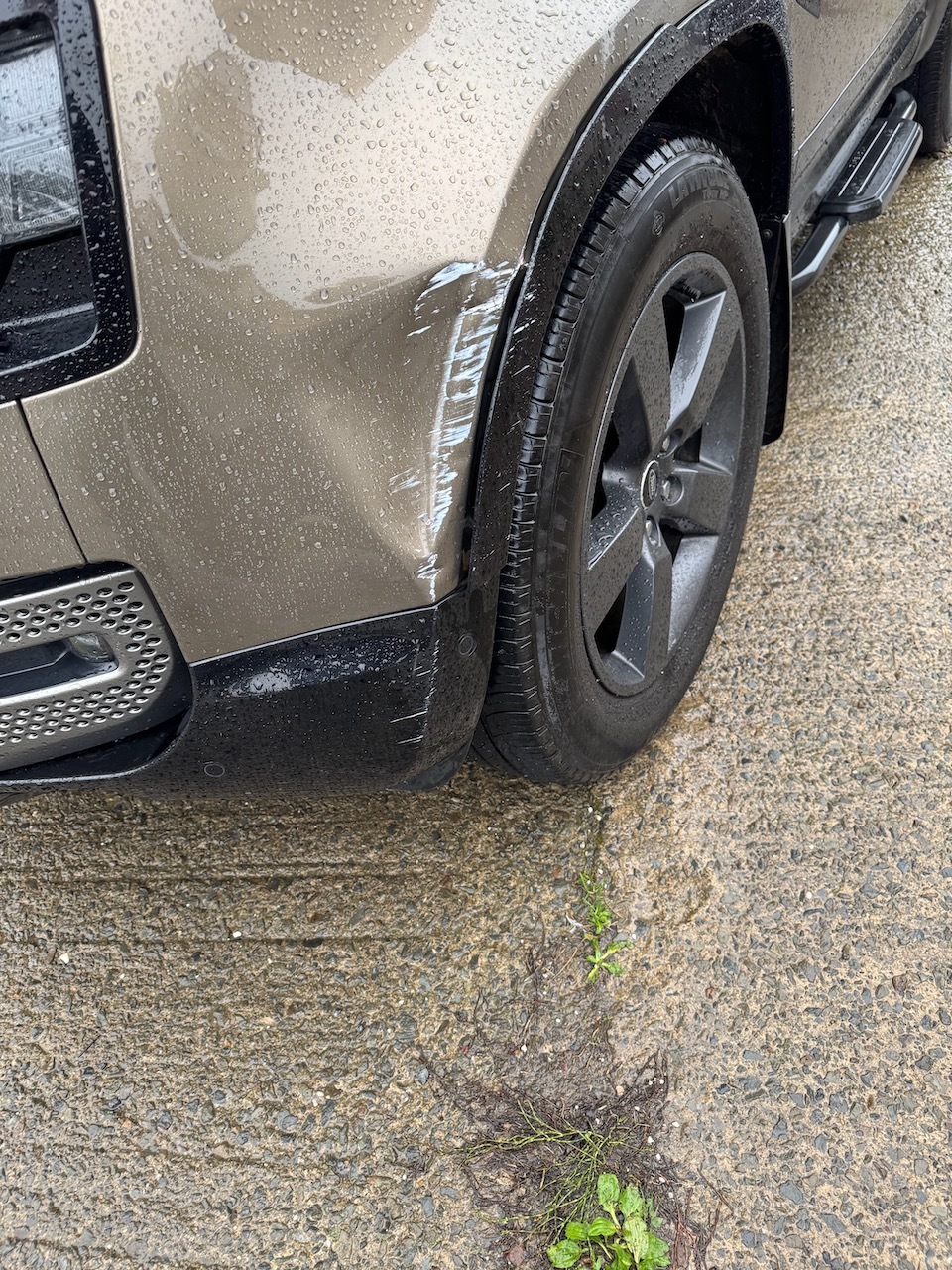 It’s only a smallish dent at the front corner but it has scratched the front of the gloss black wheel arch trim and the Gondwana stone paint around the dent.