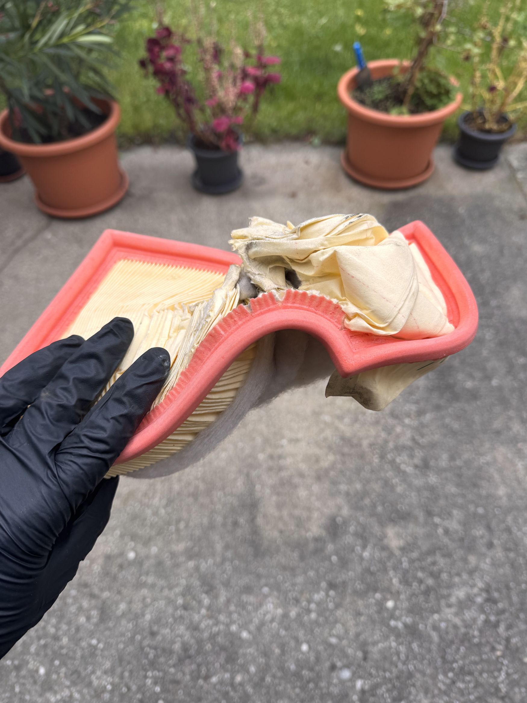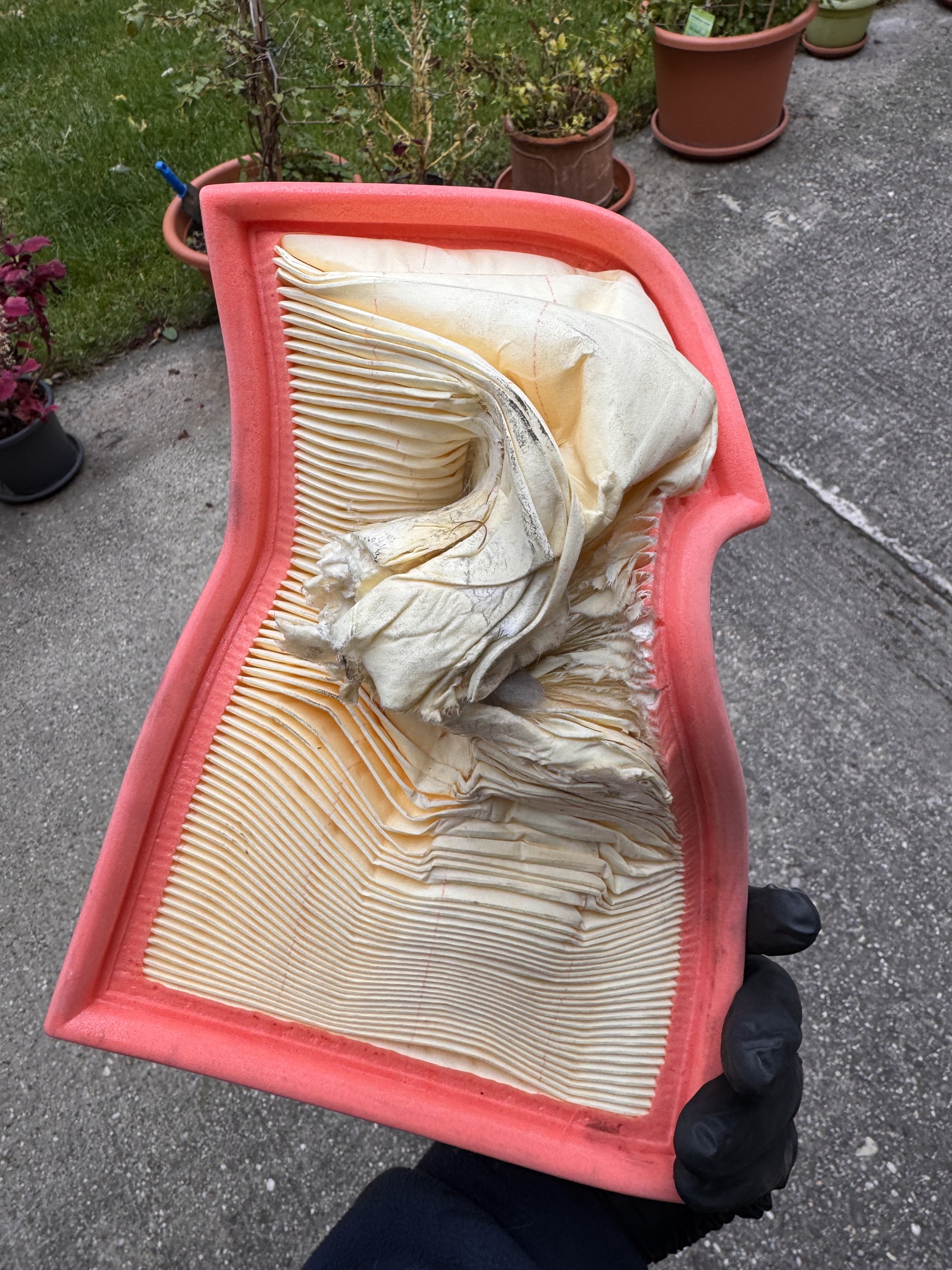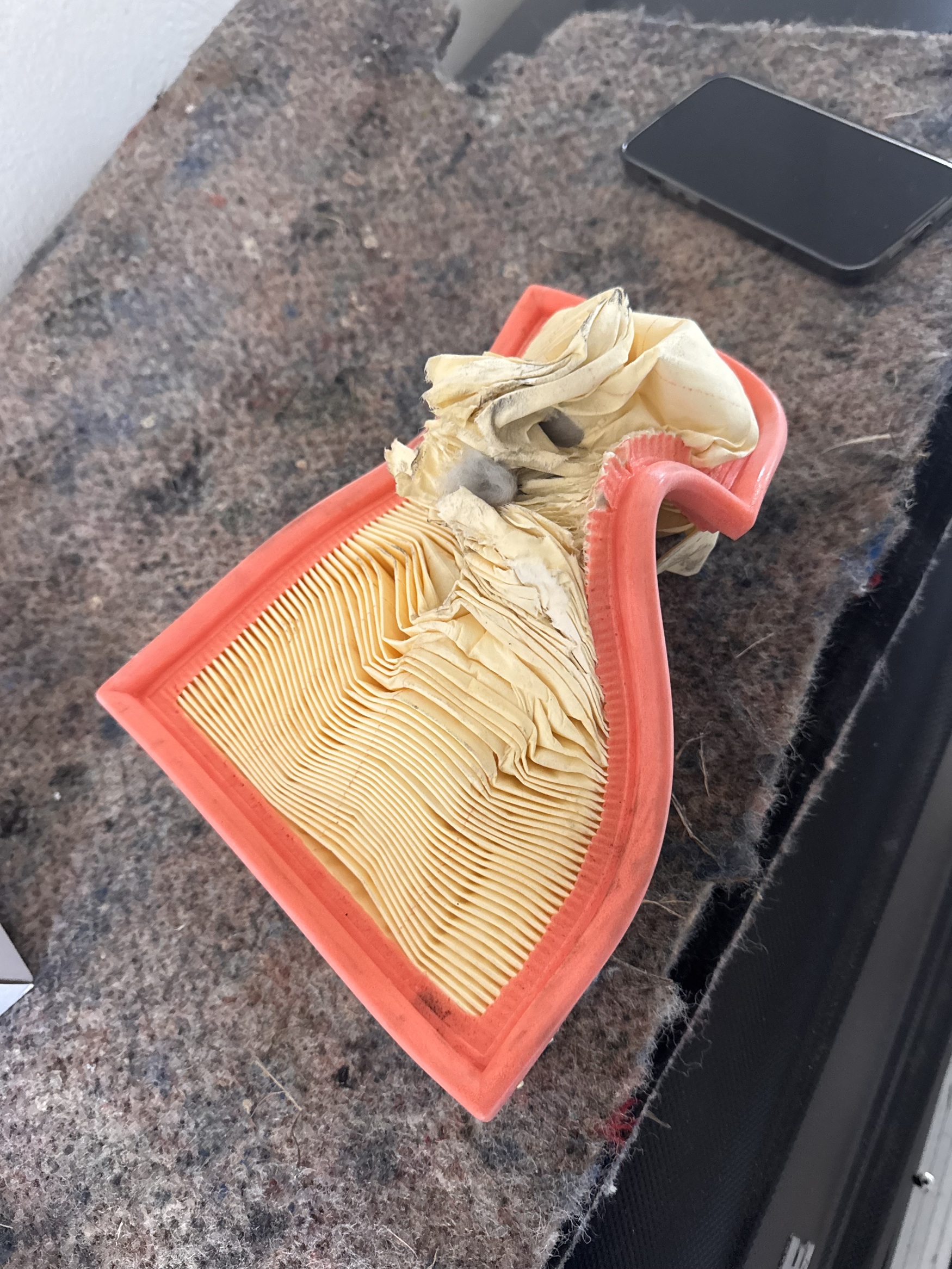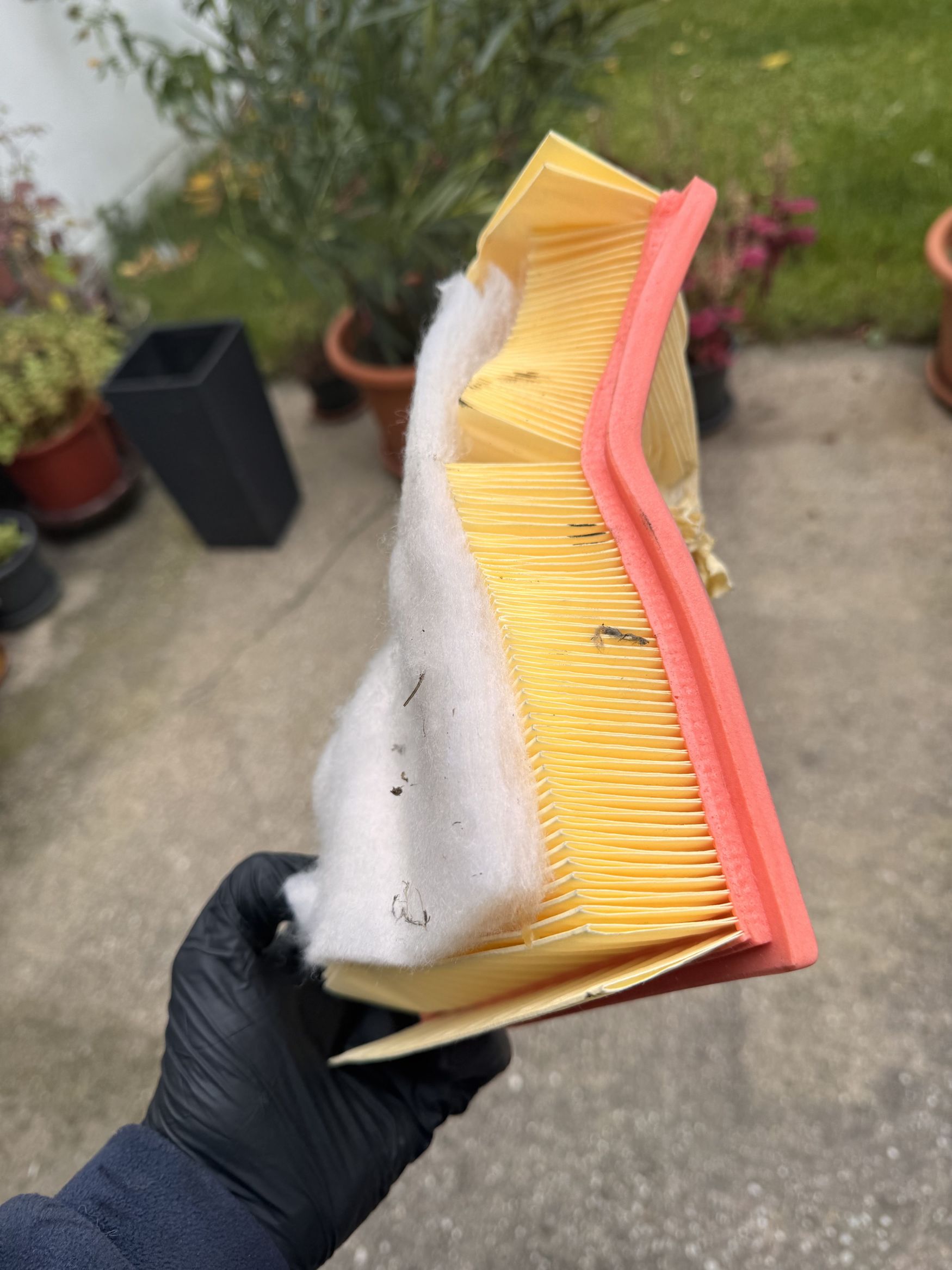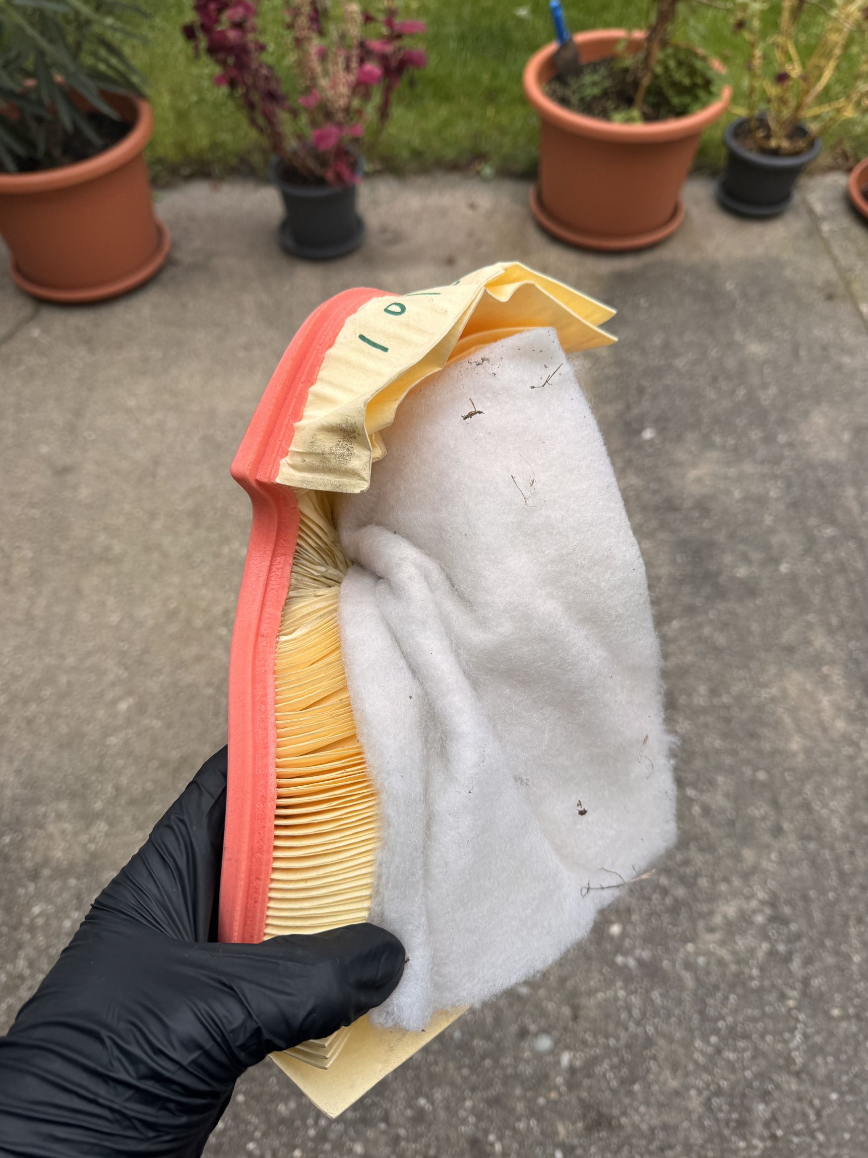 | landy andy Member Since: 15 Feb 2009 Location: Ware, Herts Posts: 6060    | I find rain spray to be the worse for Defender air filters. I can wade as deep as I want. But motorway journeys, rain and heavy spray kills air filters. I always carry a spare and swap as I drive. Although I’ve never had one as bad as yours, I just get a lack of power, then pull over and check it. | ||